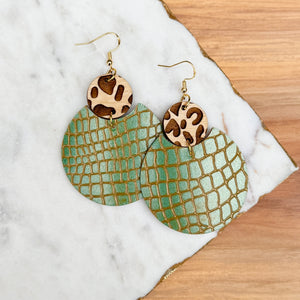 Rachael - Leopard Print + Green Snake - Wood + Leather Earrings