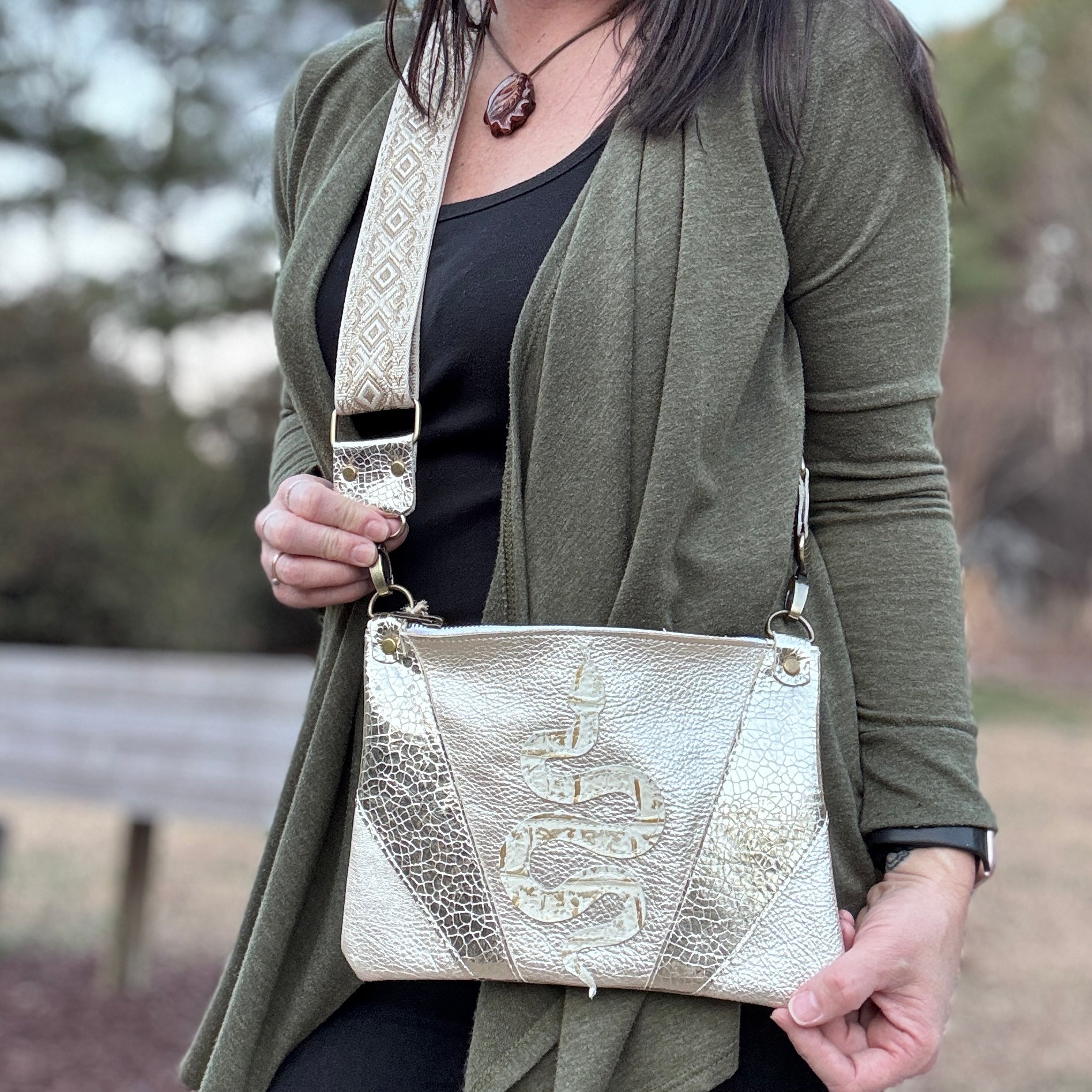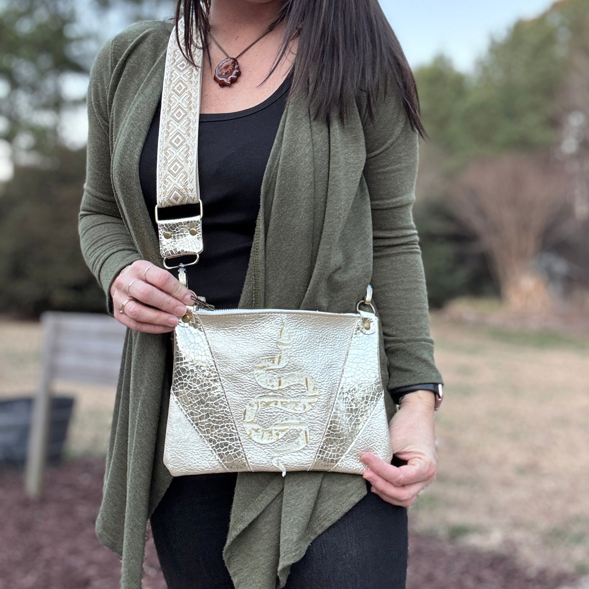 This bag measures  10” wide x 7” tall with YKK zipper and adjustable length leather + woven strap. These smaller crossbody bags are large enough to fit most your phone plus a small card wallet and your keys!