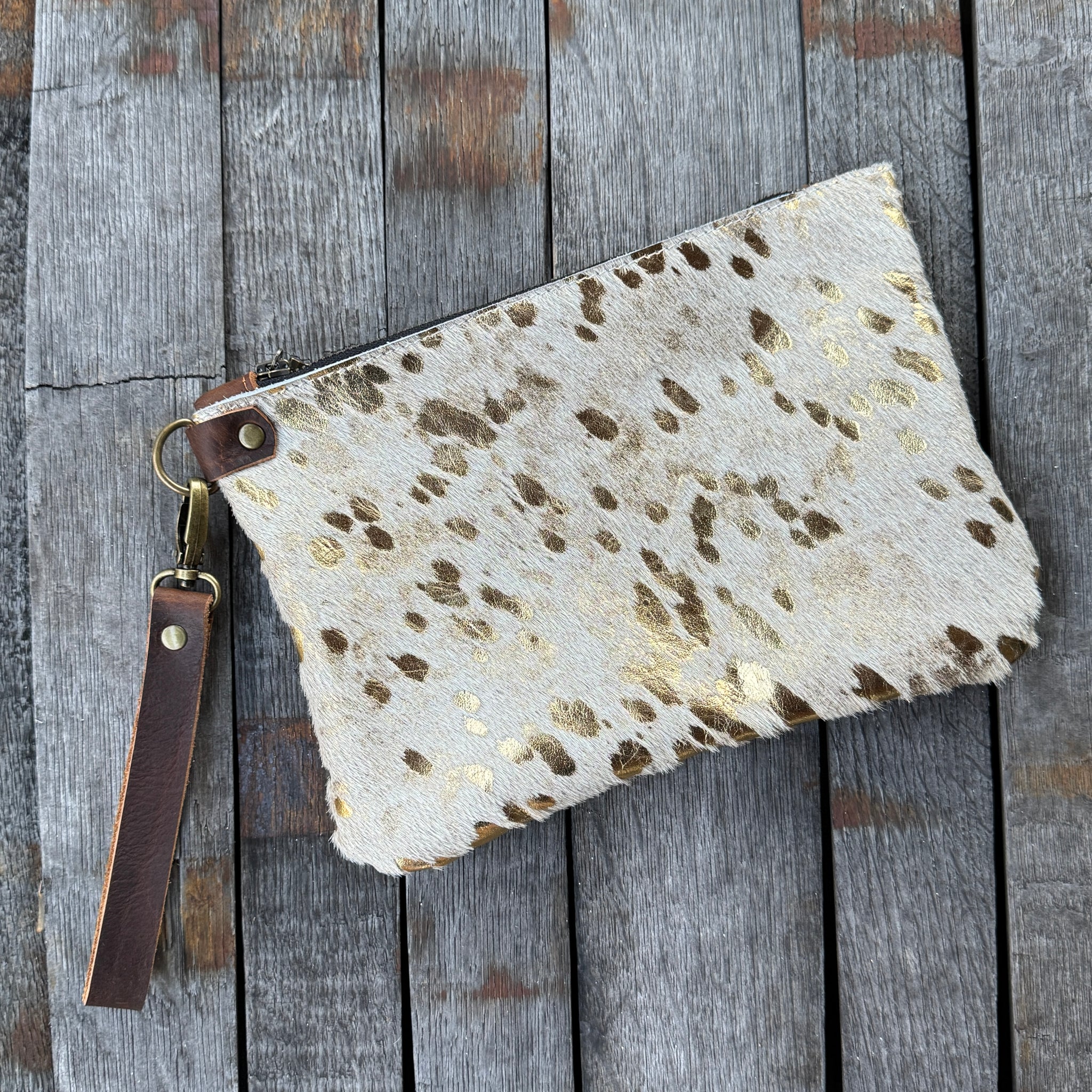 Handmade leather wristlets. This larger wristlet measures 10” wide x7” tall with YKK zipper and matching detachable wrist strap. These wristlets are large enough to fit most your phone plus a small card wallet and your keys!