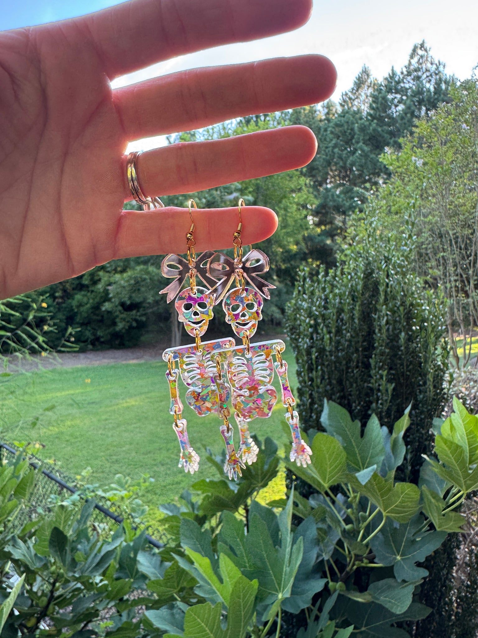 Our favorite dancing skelly is back, this time with style! Lightweight iridescent acrylic accented with a rose gold bow on 18K gold plated hooks.